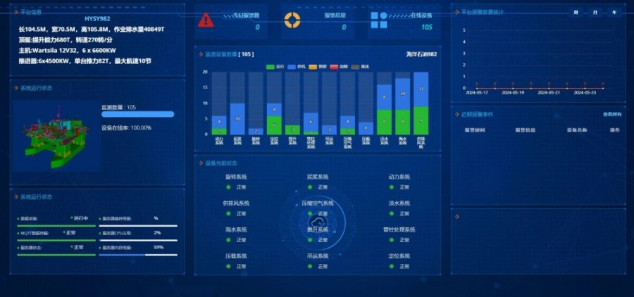 该智能监测系统是基于物联网、大数据和人工智能等前沿技术研发而成,涵盖了顶驱、推进器、主发电机组等关键设备,实现了数据采集、分析、诊断等功能。通过平台端和陆地端的数据交互,该系统能够实时监测设备运行状态,识别潜在故障和异常,为安全生产提供了有力支持。
